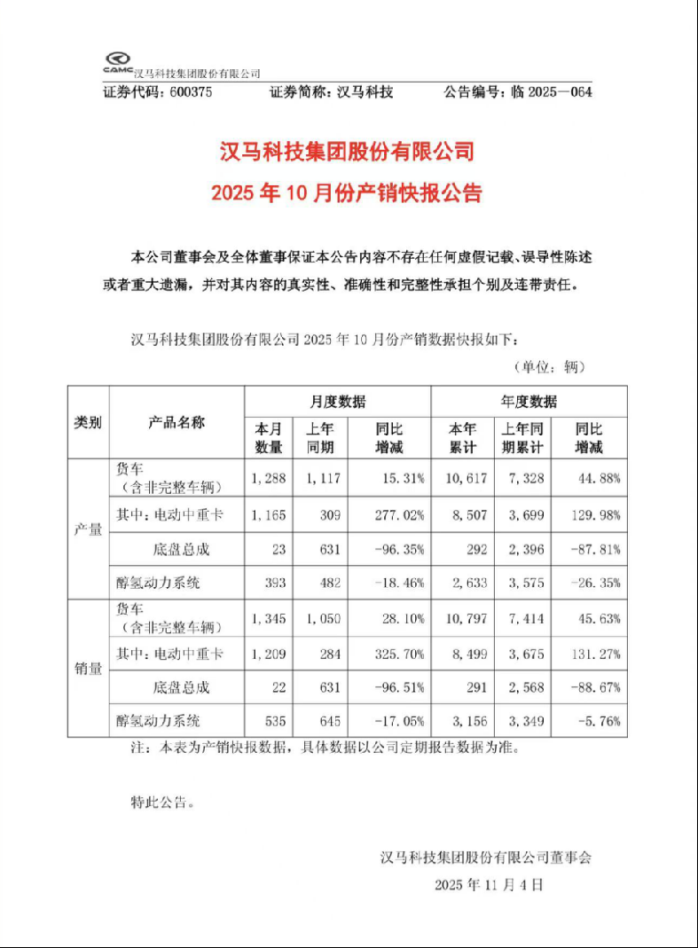 2025年11月3日,漢馬科技發(fā)布2025年10月產(chǎn)銷快報(bào),新能源中重卡產(chǎn)銷同比分別增長(zhǎng)277.02%和325.7%,1-10月累計(jì)產(chǎn)銷同比分別增長(zhǎng)129.98%和131.27%,大幅領(lǐng)跑重卡市場(chǎng)。當(dāng)月營(yíng)收預(yù)計(jì)突破6億元,創(chuàng)近5年來單月最佳成績(jī),彰顯了漢馬科技在新能源轉(zhuǎn)型戰(zhàn)略下的強(qiáng)勁發(fā)展勢(shì)頭,為企業(yè)實(shí)現(xiàn)高質(zhì)量發(fā)展注入強(qiáng)大信心。