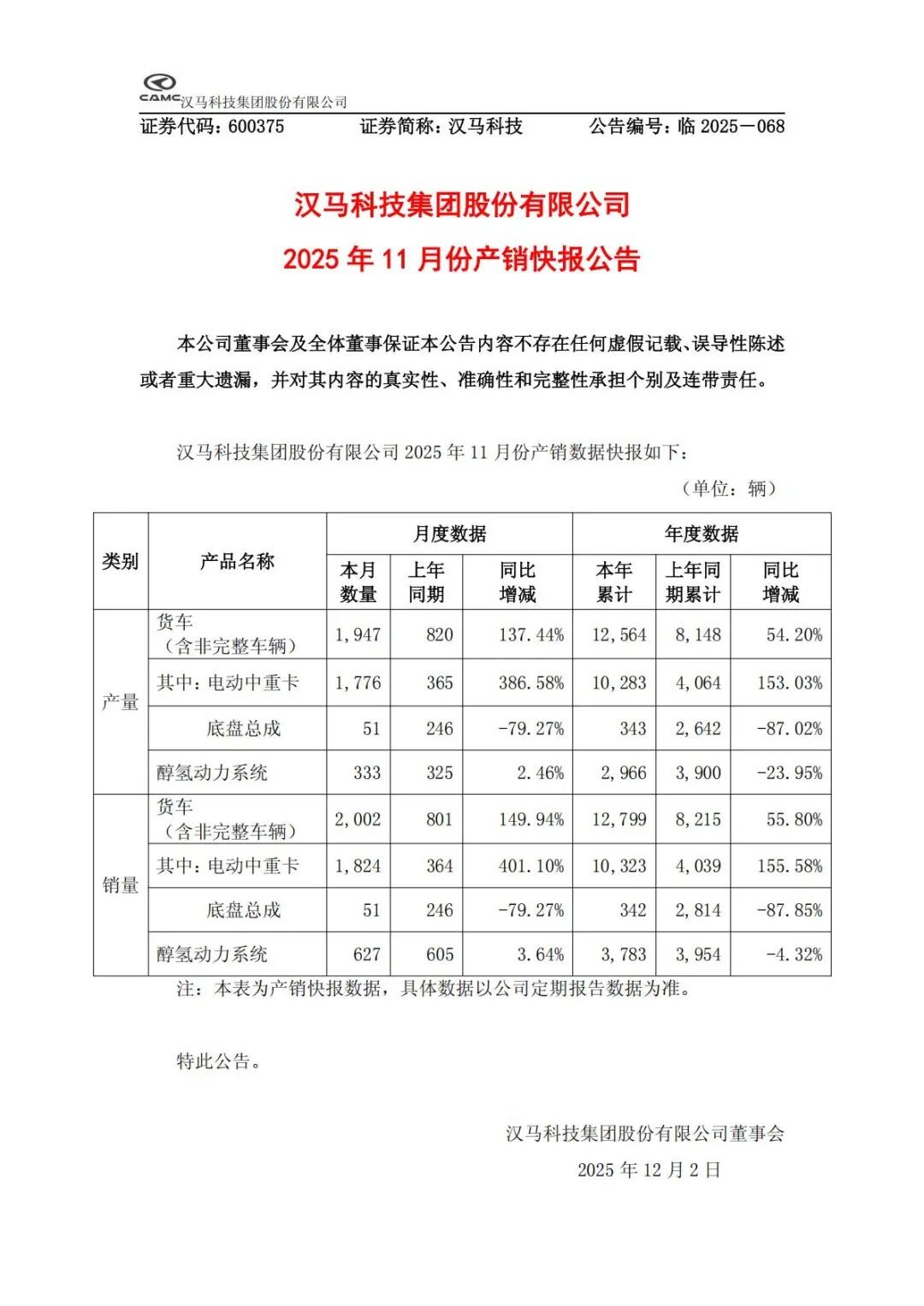 12月1日,漢馬科技發(fā)布2025年11月產銷快報。數(shù)據(jù)顯示,漢馬科技11月貨車銷量達2002輛,同比增長149.94%。其中,新能源中重卡表現(xiàn)更是亮眼,單月產銷同比增長分別達386.58%與401.10%,強勁領跑行業(yè)賽道;1-11月累計產銷同比亦實現(xiàn)153.03%和155.58%大幅增長。當月產值超9億元,創(chuàng)近年來單月最佳成績,彰顯漢馬科技在新能源轉型戰(zhàn)略下價值優(yōu)勢。