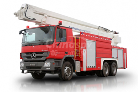 ZLJ5303JXFJP32舉高噴射消防車采用德國(guó)原裝進(jìn)口奔馳底盤,加裝美國(guó)大力公司PSP1500消防泵、美國(guó)AKRON公司3578消防炮、液壓系統(tǒng)、臂架系統(tǒng)、氣路系統(tǒng)、電器系統(tǒng)等部件改裝而成。