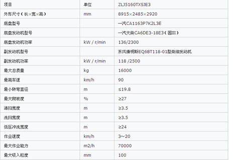 ZLJ5160TXSJE3型洗掃車采用解放定型汽車二類底盤,加裝東風(fēng)康明斯副發(fā)動(dòng)機(jī)、風(fēng)機(jī)、垃圾箱、清掃裝置、低壓降塵系統(tǒng)、吸嘴、高壓水泵、低壓水泵、清水箱、高壓清洗系統(tǒng)、液壓系統(tǒng)、氣動(dòng)系統(tǒng)、電控系統(tǒng)等部件改裝而成。主要配套件實(shí)行全球采購(gòu),性能優(yōu)良、工作可靠。