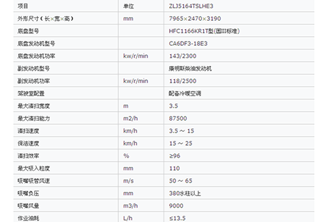 ZLJ5164TSLHE3型掃路車采用安徽江淮汽車股份有限公司HFC1166KR1T二類汽車底盤改裝,排放達到國Ⅲ標準,副發(fā)動機采用康明斯柴油發(fā)動機。副發(fā)動機驅動風機及各工作裝置,采用以吸為主、吸掃結合、干式除塵的工作原理對路面進行清掃作業(yè),擁有“掃路車清掃裝置”、“掃路車除塵裝置”、“干、濕兩用吸掃式掃路車”等多項專利,整機技術水平處于國內大型干式除塵掃路車領先地位,是我國干式除塵掃路車的開路先鋒,可與國外同類型掃路車媲美。
