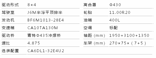 車(chē)架采用270×75×(7+5)雙層結(jié)構(gòu),承載能力強(qiáng);車(chē)架內(nèi)加強(qiáng)板(俗稱(chēng)大支架)使車(chē)架的抗彎能力、抗扭曲、抗疲勞強(qiáng)度大大加強(qiáng),懸架部分標(biāo)配德國(guó)采埃孚(ZF)公司的V型反作用桿,進(jìn)口橡膠接頭,使用壽命比普通反作用桿高6個(gè)月。后鋼板彈簧由20mm厚度增加到22mm,承載能力更強(qiáng)。
