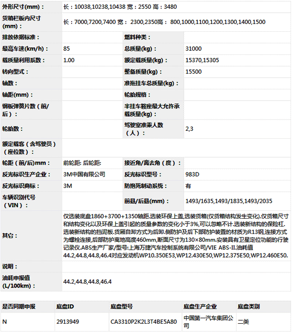 公告型號 CA5311ZLJP2K2L3T4E5A80
