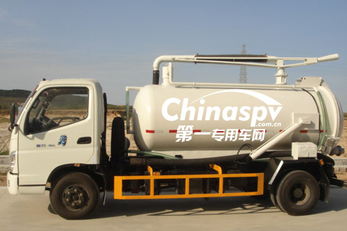 該吸污車由取力器、真空吸污泵、罐體、液壓部分,管網(wǎng)系統(tǒng)等組成,并裝有真空壓力表、視糞管,洗手水罐,抽吸吊桿總成等機(jī)構(gòu)。該車罐蓋的開(kāi)合鎖緊全部通過(guò)液壓系統(tǒng)實(shí)現(xiàn),操作快速簡(jiǎn)便。
